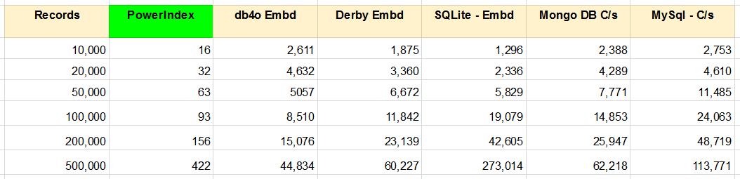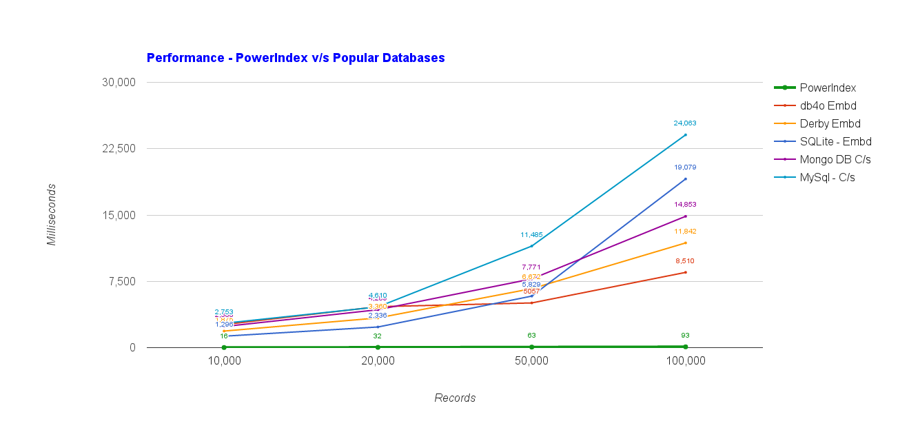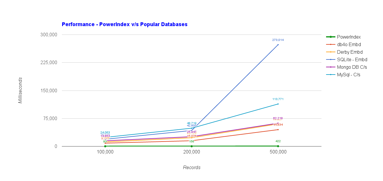 It is interesting to note that PowerIndex's performance is very consistent and just took less than Half Second to complete 500,000 insert operations. This performance holds TRUE for all basic CRUD operations.